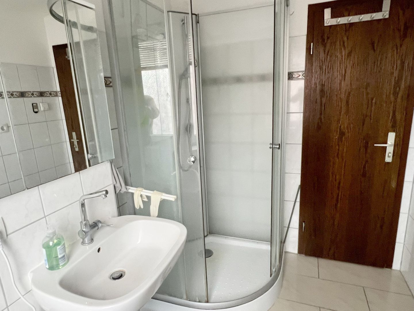 Das Duschbad mit Fenster und großer Eckdusche ist in zeitlosem Weiß gehalten.