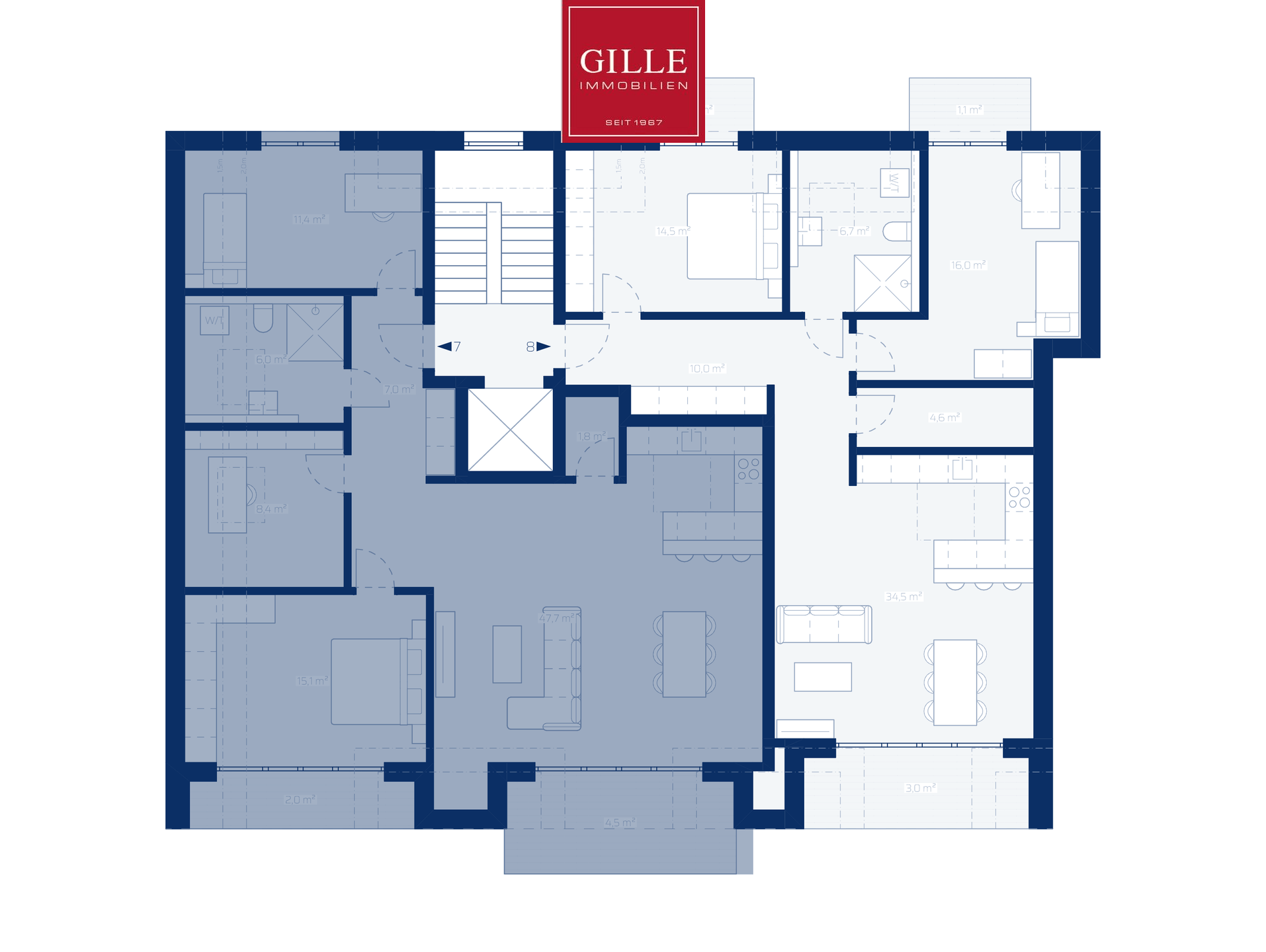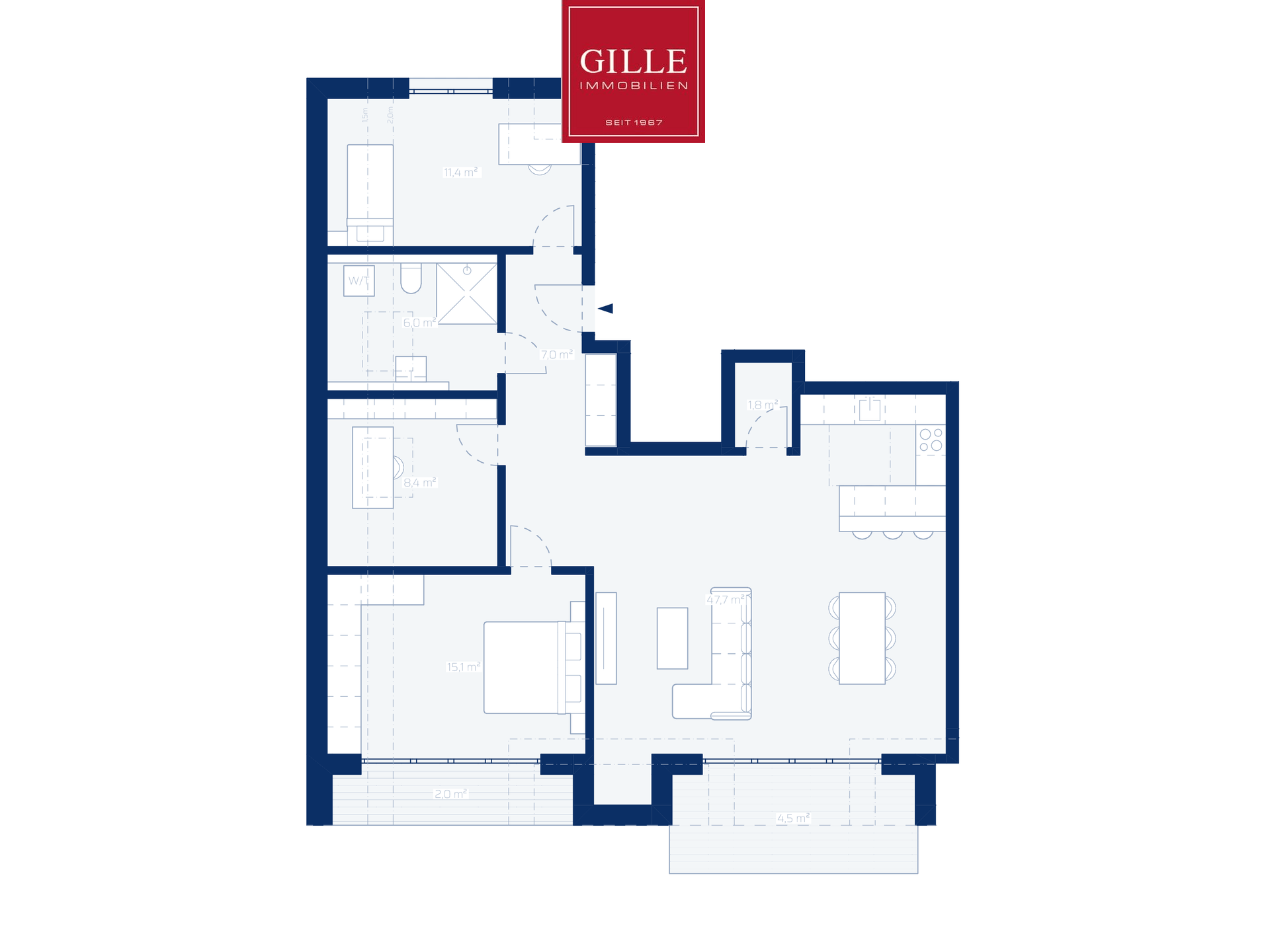 Das Herzstück der Wohnung bildet der weitläufige Wohn- und Essbereich mit offener Küche, der sich über ca. 47,7 m² erstreckt. Er bietet viel Raum für individuelle Wohnideen, gesellige Abende oder entspannte Stunden.