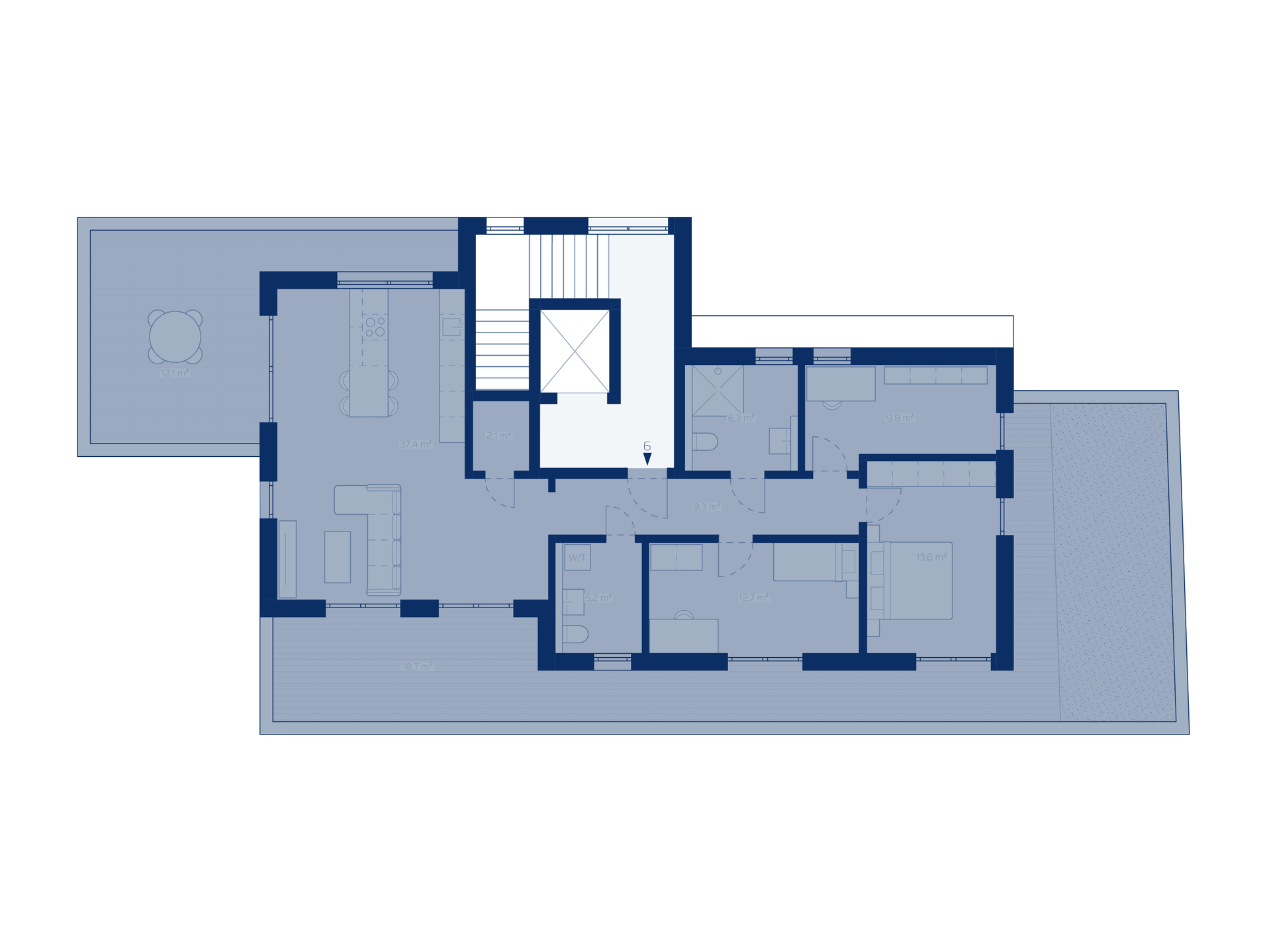 Besonders hervorzuheben sind die beiden großzügigen Dachterrassen, die eine einzigartige Wohnqualität schaffen. Jeder Wohn- oder Schlafraum verfügt über einen direkten Austritt ins Freie – so wird der Innen- mit dem Außenbereich perfekt verbunden und es entsteht ein außergewöhnliches Raumgefühl mit viel Licht und Luft.