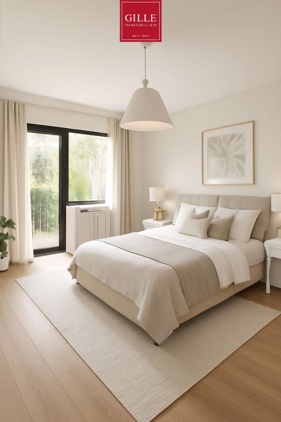 Das helle und geräumige Elternschlafzimmer wird ebenfalls mit einem neuen Vinylboden in Holzoptik ausgestattet und verfügt über einen zusätzlichen Zugang zum eigenen Garten.