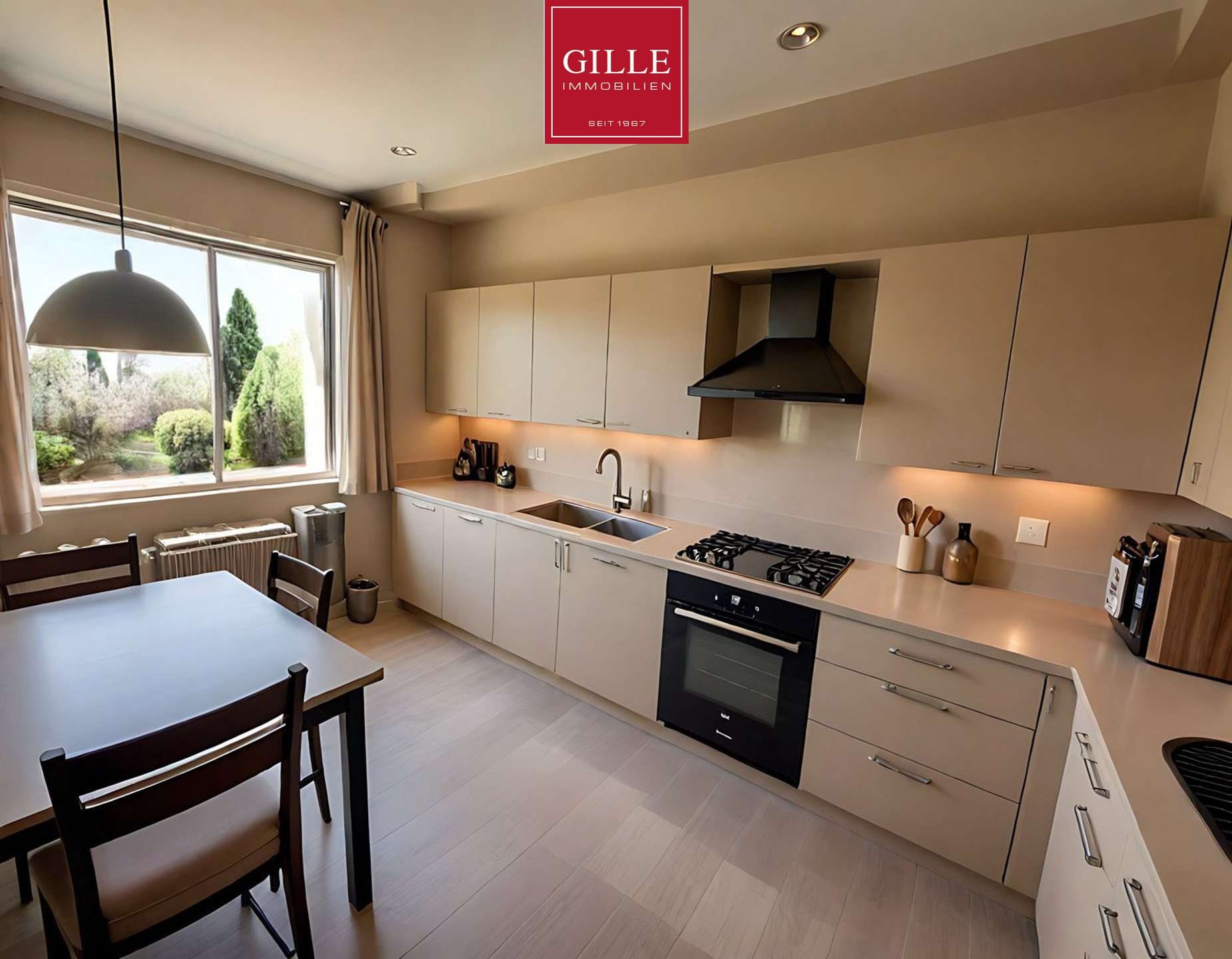 Die helle und geräumige Wohnküche ist mit einer voll ausgestatteten Einbauküche, einem hellen Fliesenspiegel und einem hellen Fliesenboden versehen. Die abgebildete Einbauküche gehört nicht zum Mietobjekt und gegen eine Abstandszahlung übernommen werden.