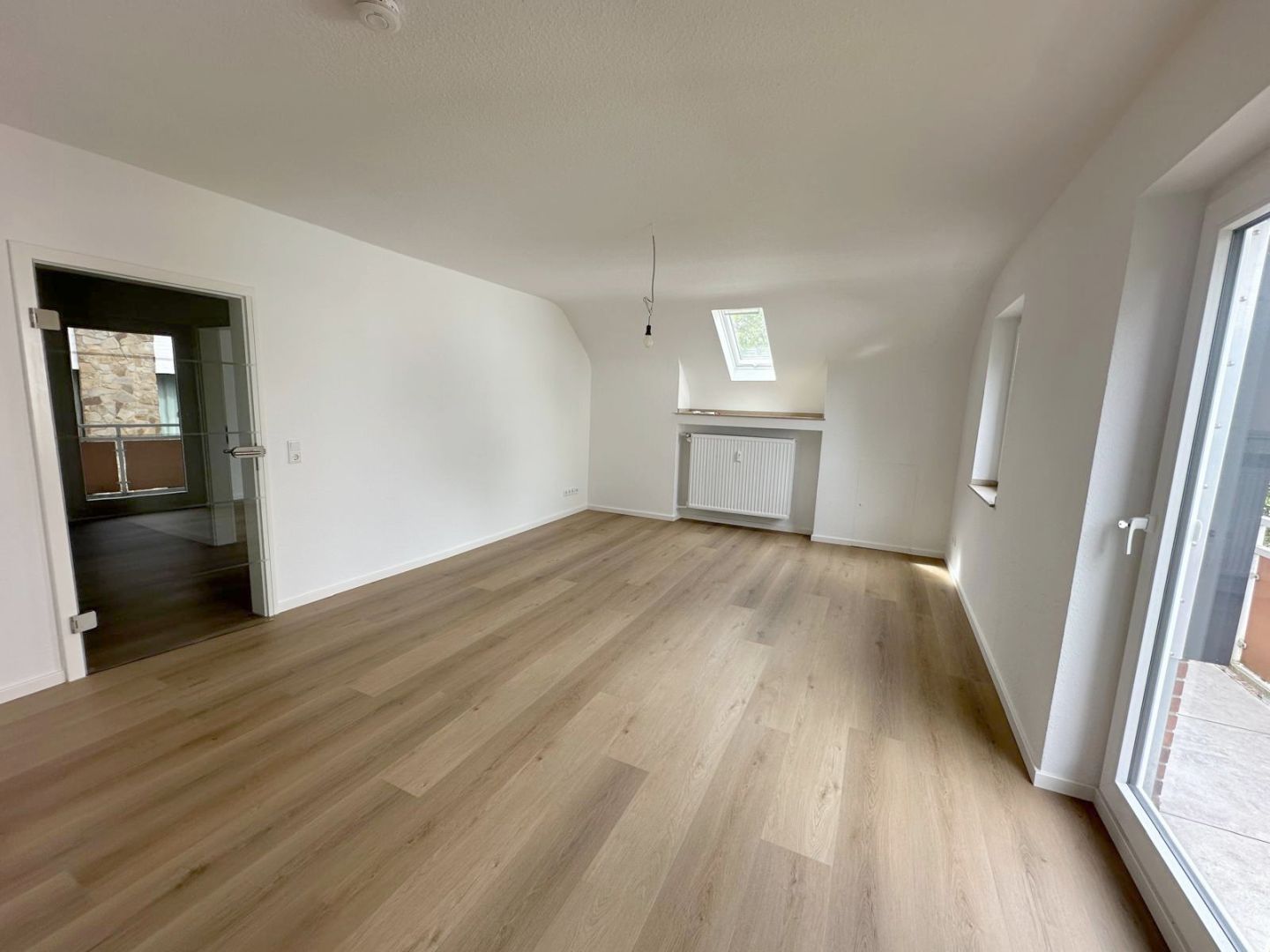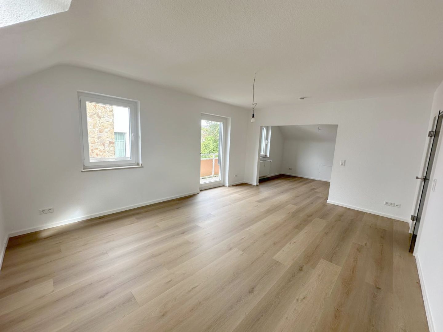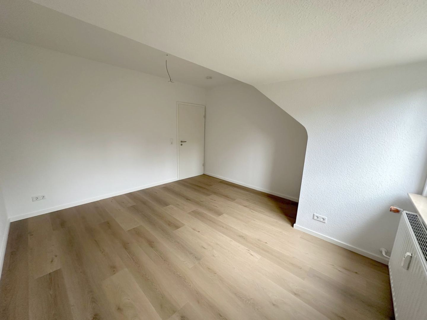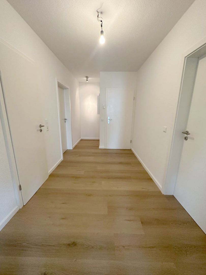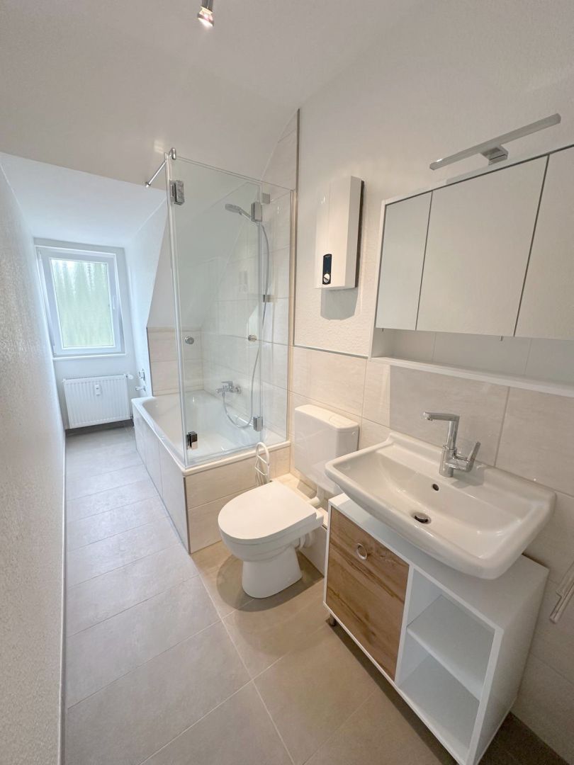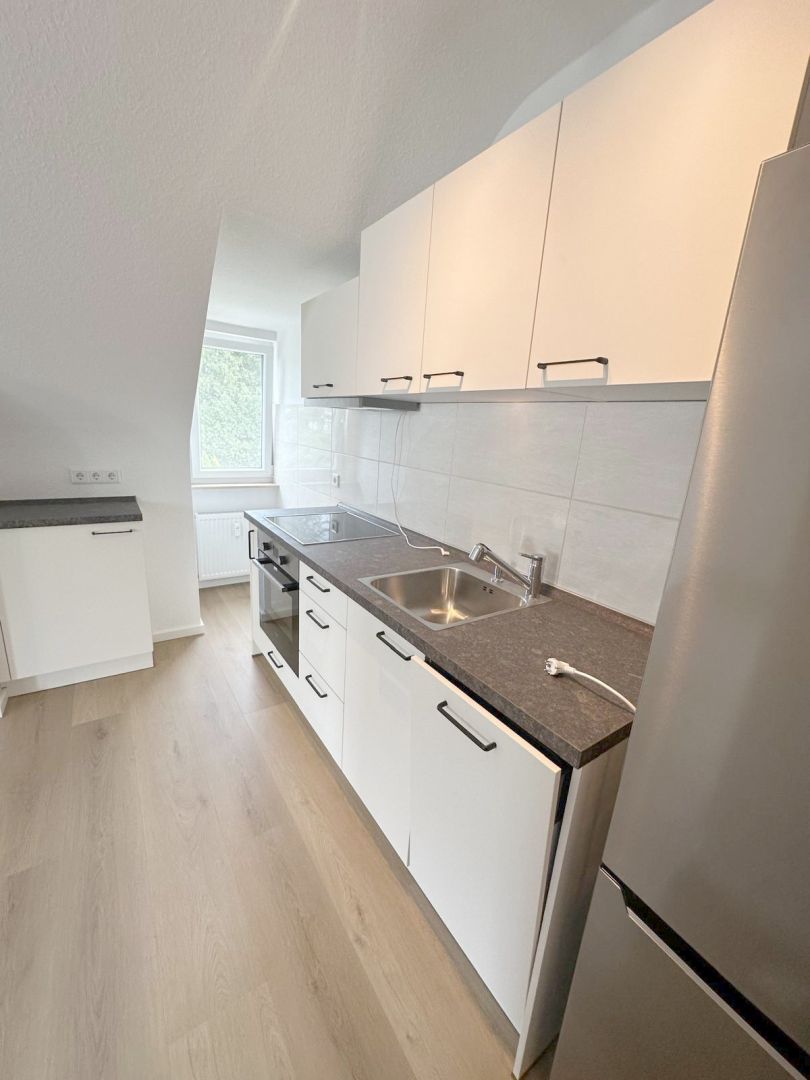Ausstattung- Sanierte 3-Zimmerwohnung im Dachgeschoss - Großzügige Eingangsdiele mit Garderobenbereich - Großer Wohnbereich mit Zugang zum Balkon sowie zum offenen Essbereich mit Küchenbereich - Einbauküche ist im Mietpreis enthalten - Modernes Tageslichtbad mit Badewanne - Helles Schlafzimmer - Geräumiges Arbeits- oder Gästezimmer - Großer eigener Kellerraum - Fahrradabstellmöglich im eigenen Kellerraum - Waschküche im Keller - Satellitenanschluss - Gegensprechanlage vorhanden - Öl-Zentralheizung - Durchlauferhitzer für die Warmwasserversorgung Die Wohnung wurde in diesem Jahr aufwendig im folgenden Umfang saniert: - Neuer u. hochwertiger Akustik-DesignVinylfussboden in der gesamten Wohnung - Neuer Türzargen und Zimmertüren - Neues Badezimmer - Neue Elektroinstallation - Wände und Decken wurden mit einer Raufasertapete versehen und weiß gestrichen - Doppelverglaste Kunststofffenster - Neues Dachflächenfenster im Wohnbereich mit elektrischer Verdunkelungsmöglichkeit - Teilweise neue Heizkörper