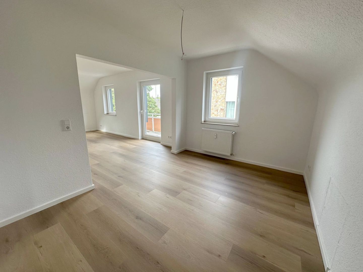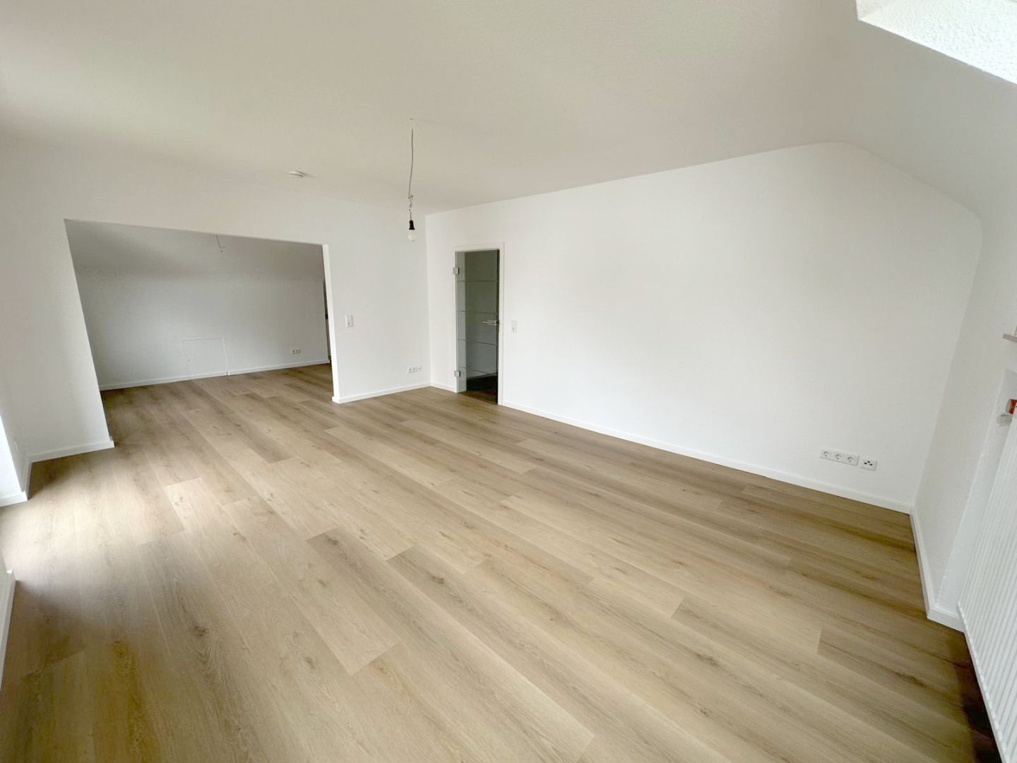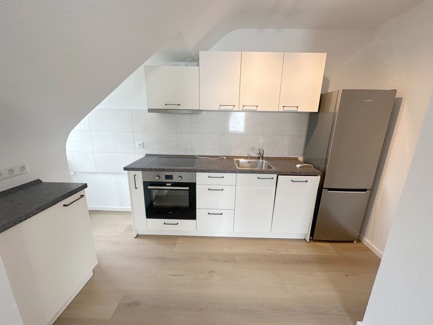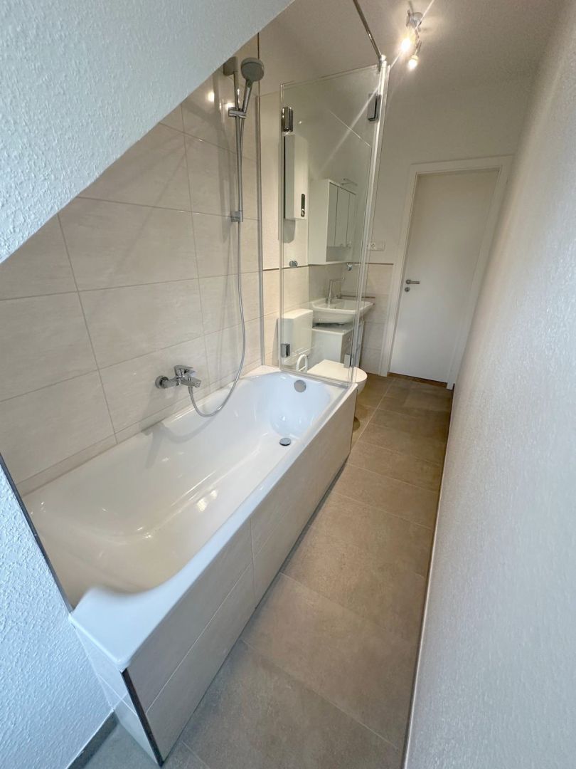 BeschreibungDie helle und repräsentative 3-Zimmer-Dachgeschosswohnung befindet sich in der 1. Etage eines 3-Parteienhauses im Neusser Lukasviertel und wurde vollständig in diesem Jahr saniert. Die hochwertig ausgestattete Wohnung verfügt über eine großzügige Eingangsdiele mit Garderobenbereich, einen großzügigen Wohnbereich mit angrenzendem und offenen Essbereich inklusive Einbauküche, einen Balkon, ein saniertes Tageslichtbadzimmer mit Badewanne, ein geräumiges Schlafzimmer sowie ein helles Arbeits- oder Gästezimmer. Der helle und lichtdurchflutete Wohnbereich bietet Ihnen den Zugang zu dem Balkon sowie dem offenen Essbereich mit angrenzender Küche inklusive Einbauküche und Deckenleuchte. Die auf den Fotos abgebildete Einbauküche ist im Mietpreis enthalten und mit einem Backofen, einem Ceranfeld, einer Dunstabzugshaube, einer Spüle, einer kleinen Spülmaschine sowie einer Kühl- und Gefrierkombination ausgestattet. Das Tageslichtbadezimmer wurde im Zuge der Sanierung vollständig erneuert und verfügt über eine Badewanne inkl. einer maßgefertigten Duschabtrennung aus Glas, ein WC, ein Waschbecken inkl. Unterschrank, einen Spiegelschrank inkl. Beleuchtung, eine Deckenleuchte, ein Fenster und einen Durchlauferhitzer. Alle Sanitärgegenstände sind in weiß gehalten und bilden mit den großformatigen hellbeigen Wandfliesen sowie die den großformatigen beigen Bodenfliesen ein stimmiges Bild. Das geräumige Schlafzimmer bietet Ihnen Platz für ein Doppelbett und einen großen Kleiderschrank. Das helle Arbeits- oder Gästezimmer ist mit 2 Sprossenfenstern versehen. Zu der Wohnung gehört ein eigener und großer Kellerraum, wo auch Ihre Fahrräder Platz finden sowie eine Waschküche im Keller. Die Beheizung der Wohnung erfolgt über eine Öl-Zentralheizung. Die Warmwasserversorgung wird über einen Durchlauferhitzer generiert. Die Treppenhausreinigung, die Reinigung der Waschküche und der Winterdienst wird abwechselnd von den Mietern übernommen.