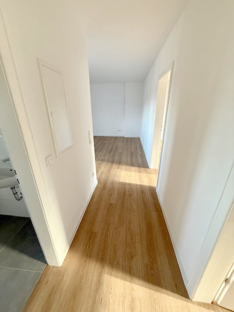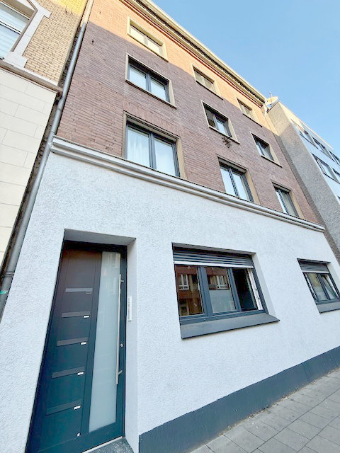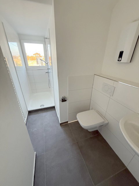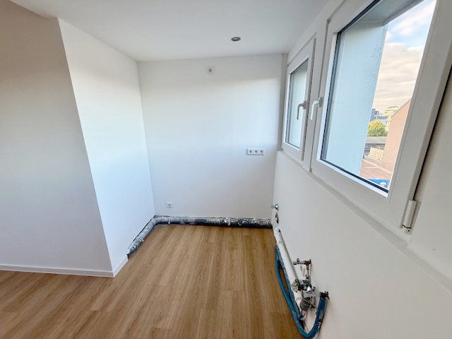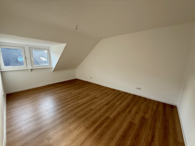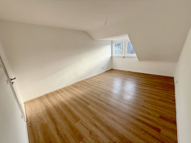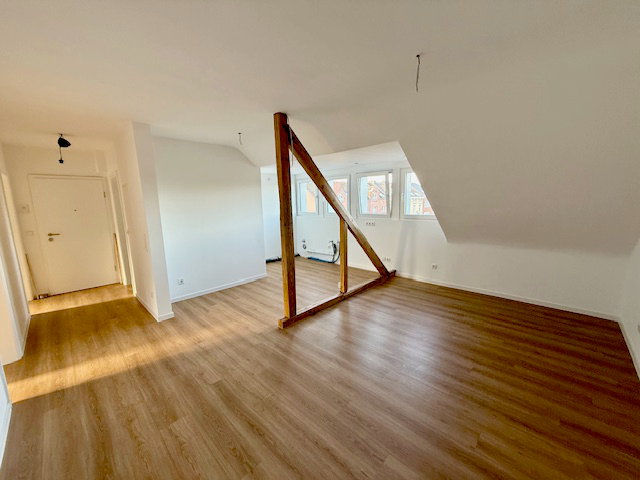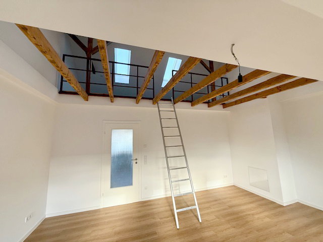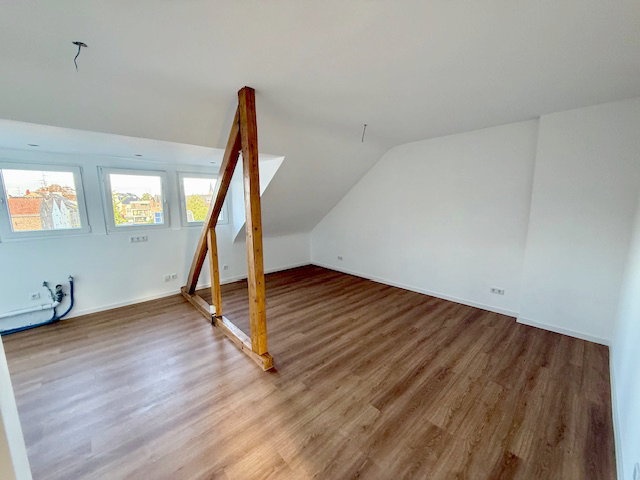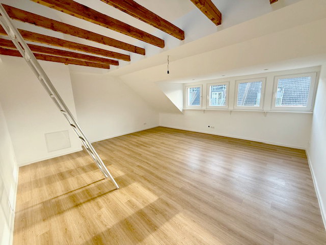 BeschreibungDiese großartige 3-Zimmerwohnung befindet sich in der 4. Etage im Dachgeschoss eines gepflegten Mehrfamilienhauses in zentraler Lage der Neusser Innenstadt. Die im Jahr 2024 sanierte Wohnung verfügt über eine zentrale Eingangsdiele mit offenem Wohnbereich inkl. Küchennische, ein Hobby- oder Arbeitszimmer mit einer Empore, ein Schlafzimmer und ein modernes Tageslichtduschbad. Im offenen und einladenden Essbereich ist die Küchennische mit einer Holzbalkenkonstruktion abgegrenzt und gibt dem Bereich einen besonderen Charme. In der Küchennische können Sie eine Einbauküche individuell und nach eigenem Geschmack planen. Das außergewöhnlich gestaltete Wohnzimmer ist mit schönen Holzbalken zum Giebel hin ausgestattet und bietet Ihnen eine gemütliche Empore, welche über eine Leiter zu begehen ist. Das geräumige Schlafzimmer bietet Ihnen genügend Platz für ein Doppelbett sowie einen Kleiderschrank. Das moderne Badezimmer mit Fenster ist mit einer Dusche, einem Waschbecken, einem Spiegel, einem WC, einem Handtuchheizkörper und einem Durchlauferhitzer ausgestattet. Alle Sanitärgegenstände sind in weiß gehalten und bilden mit den großformatigen anthrazitfarbenen Bodenfliesen und weißen Wandfliesen ein stimmiges Bild. Im Zuge der Sanierung wurden alle Wohn- und Schlafräume sowie die Diele mit einem modernem Vinylboden in Holzoptik ausgestattet. Zur Wohnung gehört außerdem der Dachboden, welcher als Kellerersatz genutzt werden kann. Ihre Waschmaschine können Sie im Keller in der Waschküche unterbringen. Die Beheizung erfolgt über eine Fußbodenheizung. Die Warmwasserversorgung erfolgt über einen Durchlauferhitzer. Die Treppenhausreinigung wird von einer Reinigungskraft vorgenommen und ist in der Nebenkostenvorauszahlung enthalten. Optional kann ein PKW-Außenstellplatz angemietet werden.
