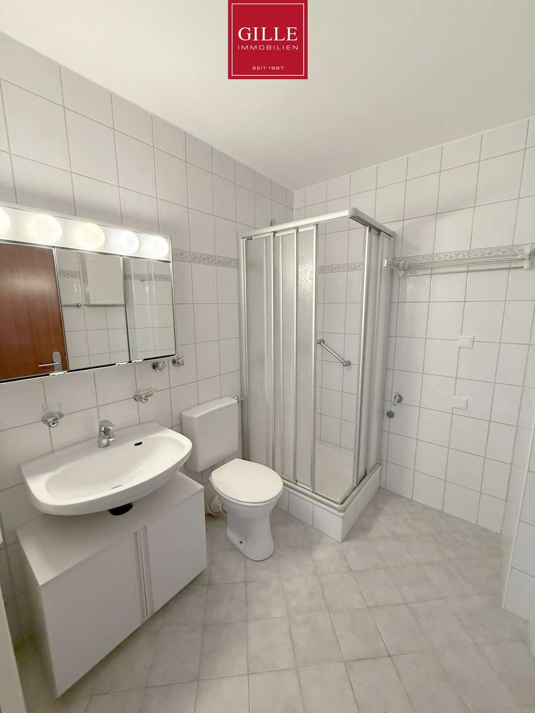 Im Duschbad finden Sie eine Dusche, ein WC, ein Waschbecken mit Unterschrank, einen Spiegel-schrank und ein WC. Alle Sanitärgegenstände sind in Weiß gehalten und bilden mit den weiß-hellgrau marmorierten Wandfliesen inkl. grauer Bordüre und den hellgrau marmorierten Bodenfliesen ein stimmiges Bild. Das Gäste-WC ist im selben Stil wie das Duschbad und verfügt über ein WC, ein Waschbecken und einen Spiegel.